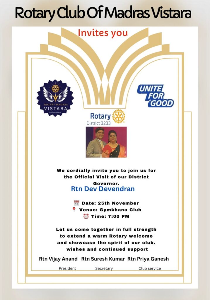 Let us come together in full strength to extend a warm Rotary welcome and showcase the spirit of Rotary Club of Madras Vistara.